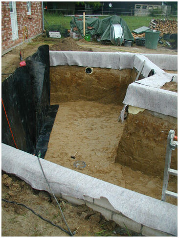 Der neue Teich erhielt keine Stufen, gerade Wände für viel Fassungsvermögen, eine Trittstufe zum Füttern und Baden sowie einen separaten Pflanzenfilter. Vor dem Ausschweißen wurde alles mit einem dicken Flies ausgelegt.